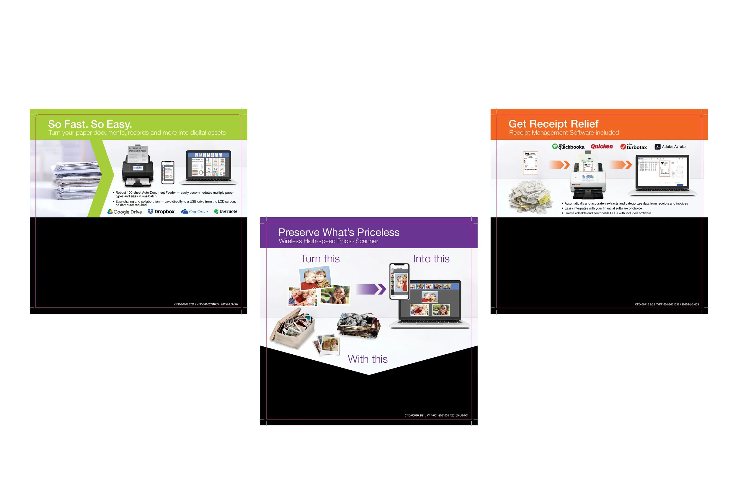 All three of these were laid out in InDesign but the images were put together in Photoshop. Some of the graphics were provided, like the images of the scanners, laptop and the logos, but everything else I found in Adobe stock images.