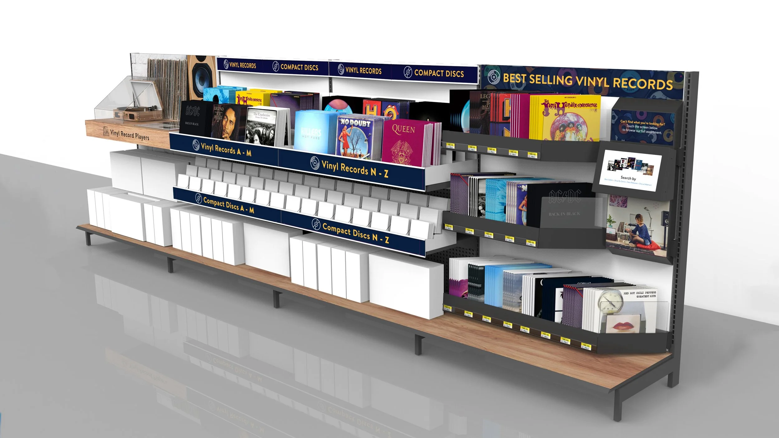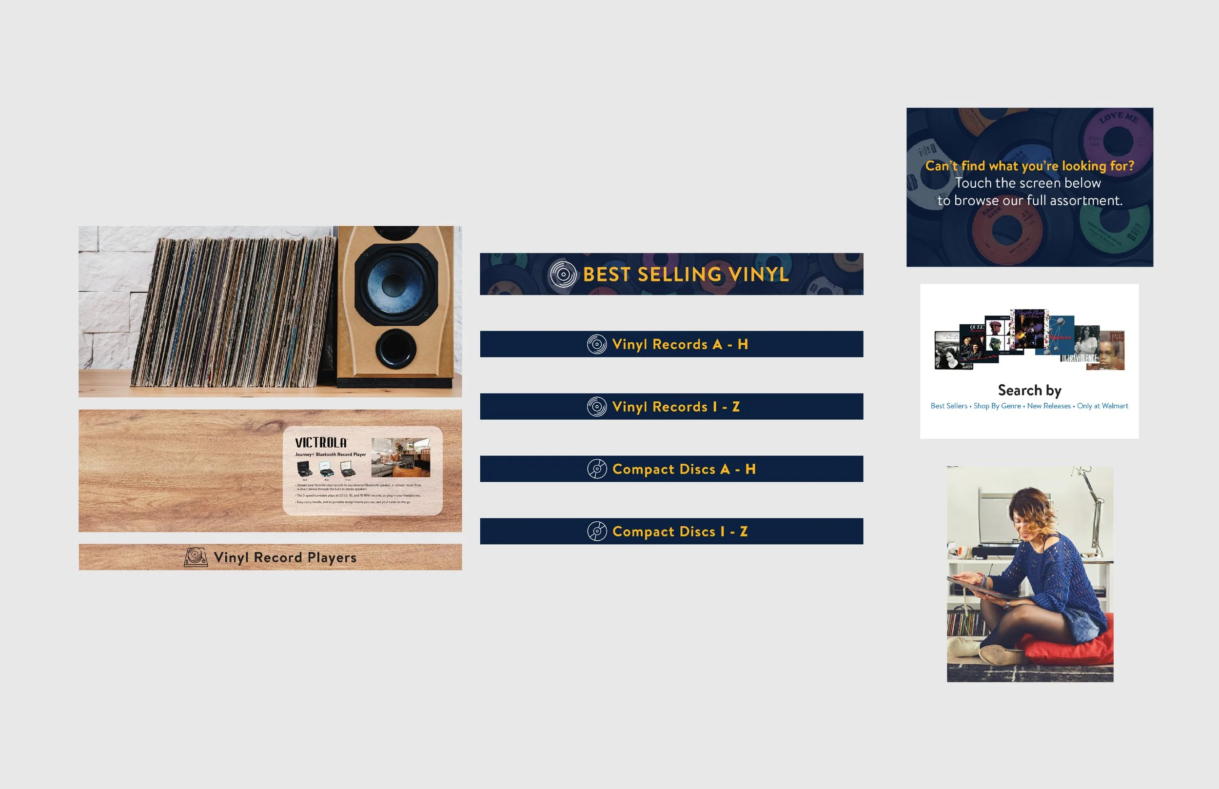 Incorporate the warmth and nostalgia from the little corner record stores into the display. Together with a 3D designer, we came up with the idea to add wood to the base and in the area with the featured record player. I chose “in-situation” lifestyle imagery behind the tester record player to give the illusion of it being in someone’s home. The overall graphics still use the brand font and colors but just with added touches.